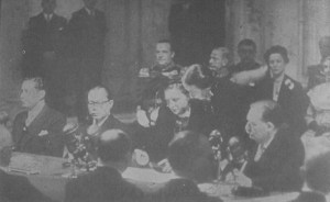 De soevereiniteitsoverdracht in Den Haag in 1949, met koningin Juliana en vice-president Hatta