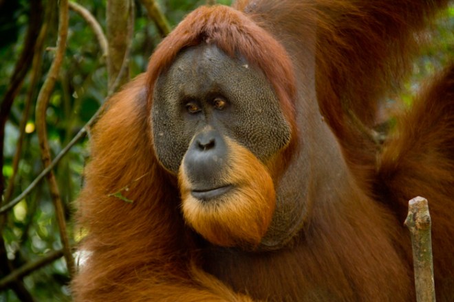 Een orang-oetan in debuurt van het bekende toeristendorpje Bukit Lawang in Noord-Sumatra. Orang-oetans leven hier in het wild, maar al sinds de jaren 70 is er een beschermingscentrum aanwezig. Er wonen ongeveer 5000 orang-oetans rond Bukit Lawang.