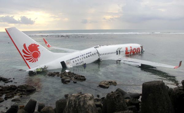 Een Boeing van de Indonesische luchtvaartmaatschappij Lion Air is zaterdag in zee terechtgekomen, vlakbij de landingsbaan van Ngurah Rai International Airport op Bali. Het vliegtuig brak bij de crash doormidden, maar alle inzittenden hebben het overleefd.