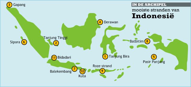 De elf stranden die ik hierboven heb uitgekozen zijn verspreid over heel Indonesië. Natuurlijk zijn er nog veel meer mooie stranden, en er is zeker discussie mogelijk over deze lijst. Op onderstaand kaartje kun je de locaties van de bovengenoemde stranden zien, en graag hoor ik ook toevoegingen bij de reacties. Zie ook het artikel Overzicht: de stranden van Java voor een uitgebreider overzicht van de stranden rond het eiland Java.