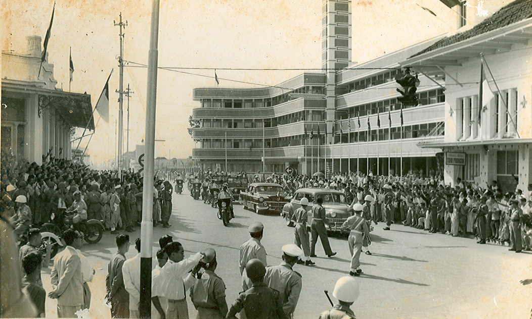 Een parade voor het Hotel Savoy Homann tijdens de Aziatisch-Afrikaanse Conferentie van 1955.