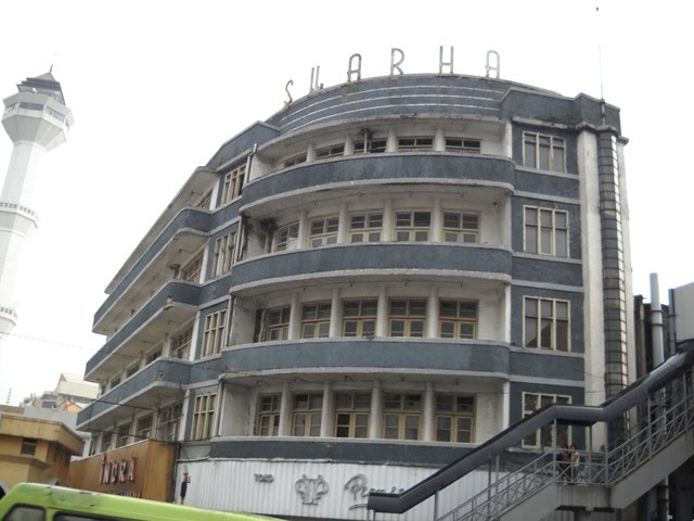 Het verlaten gebouw van Hotel Swarha staat direct naast de Grote Moskee van Bandung; de minaret is op de foto te zien.