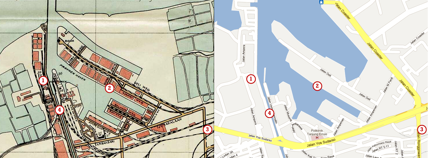De haven van Semarang op twee kaarten (op dezelfde schaal). De linker kaart is een uitsnede van de stadsplattegrond van Semarang uit 1935 (bron: Koninklijk Instituut voor de Tropen). De rechter kaart is van Google Maps. De nummers geven de locaties van onderstaande foto’s aan.