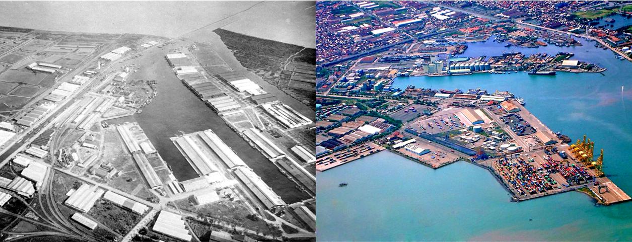 Links: Havenkranen aan de Prouwenhaven van Semarang in 1936 (foto: Tropenmuseum). Rechts: Kunstmestsilo’s op min of meer dezelfde plaats in 2011 (foto: Syaiful Amri).