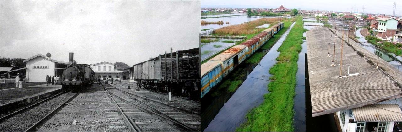 Het station Tambaksari in gebruik in de koloniale tijd, en dezelfde locatie in verlaten toestand nu.