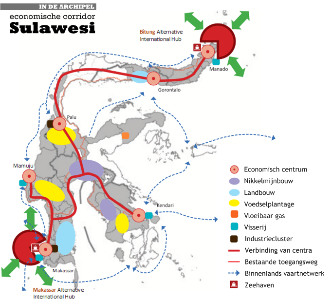 Het ontwikkelingsthema dat de Indonesische overheid heeft uitgekozen voor de ‘economische corridor’ Sulawesi is: “Het centrum voor de productie en verwerking van landbouw, plantages, visserij, olie, gas en mijnbouw”.