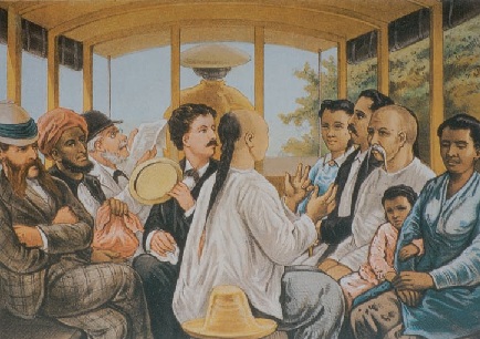 Passagiers in de paardentram. Tekening van Josias Cornelis Rappard (1888). Het beeld laat zien dat de doelgroep van de tram inderdaad divers was.
