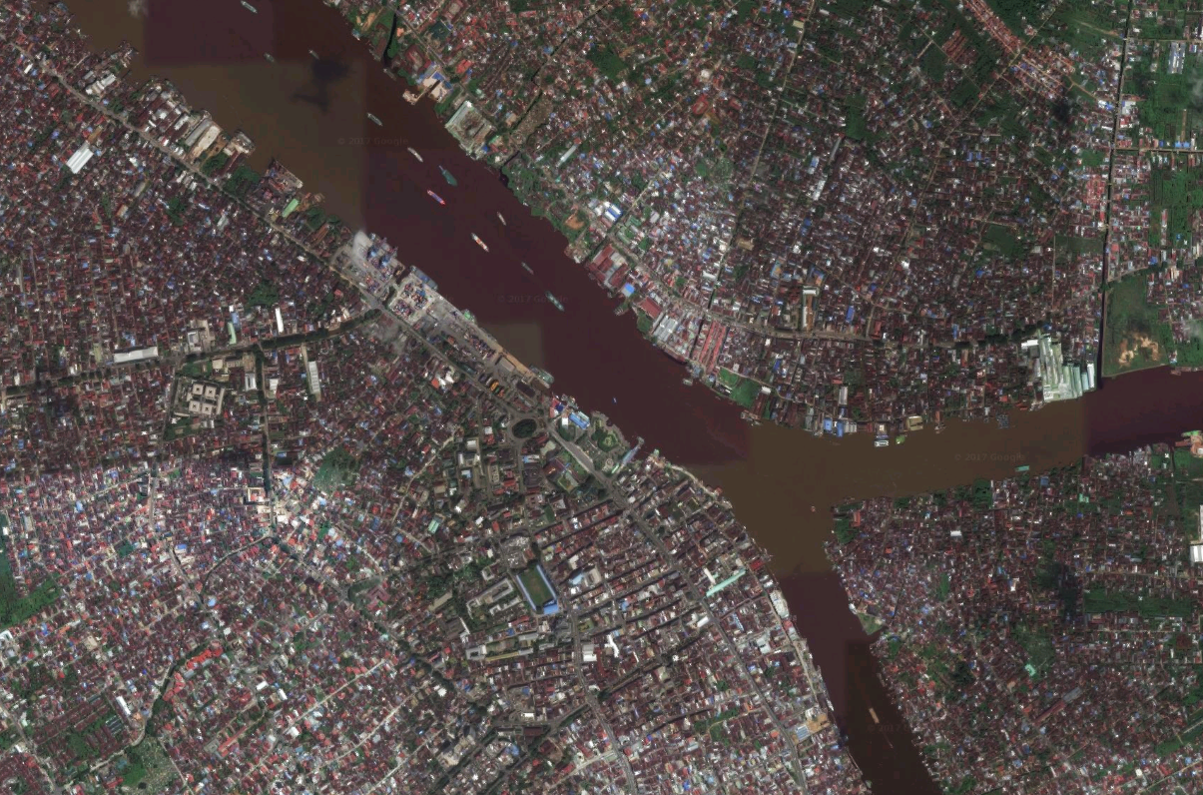 Pontianak van bovenaf. Het centrum ligt bij de samenvloeiing van de rivieren, vooral aan de zuidwestkant.