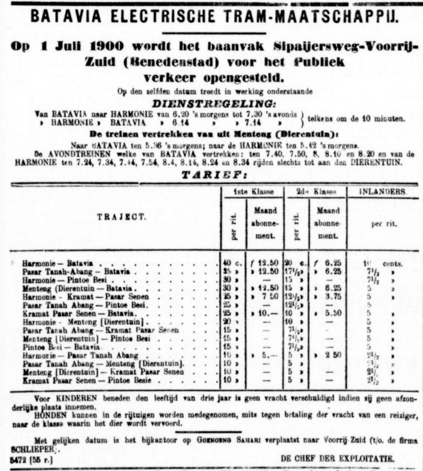 “Aan den heer R.A. EEKHOUT is bij Gouvernements Besluit van 17 Juli No. 17 de concessie verleend voor den aanleg en de exploitatie van een elektrischen tramweg ter hoofdplaats Batavia, loopende van Kramat, over Lontar satoe Pengarengan Menteng, Kampong ima en Tanah Abang tot aan de Societeit Harmonie, met zij takken van Menteng langs Koningsplein Oost en Citadelweg tot aan de brug bij het noordelijk einde van dien weg, en van Koningsplein Oost door de Willemslaan langs Waterlooplein Zuid, Cipaijersweg, Goenoeng Saharie Oost en den Jakatraschenweg tot aan het kruispunt der Voorrij-zuid met de Buiten Nieuwpoortstraat. Het waarborgkapitaal bedraagt 15.000 en de lijnen moeten binnen twee jaren in exploitatie zijn gebracht.”
