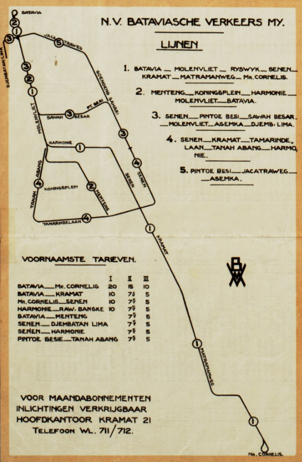 Tramkaart topografische dienst Batavia 1933 Gepubliceerd 21 november 2017 at 596 × 909 in Trams in Batavia: overzicht en plattegronden ← Vorige Tramkaart van de BVM-lijnen behorende bij een Stadskaart van Batavia en Meester-Cornelis uit 1933/1934.