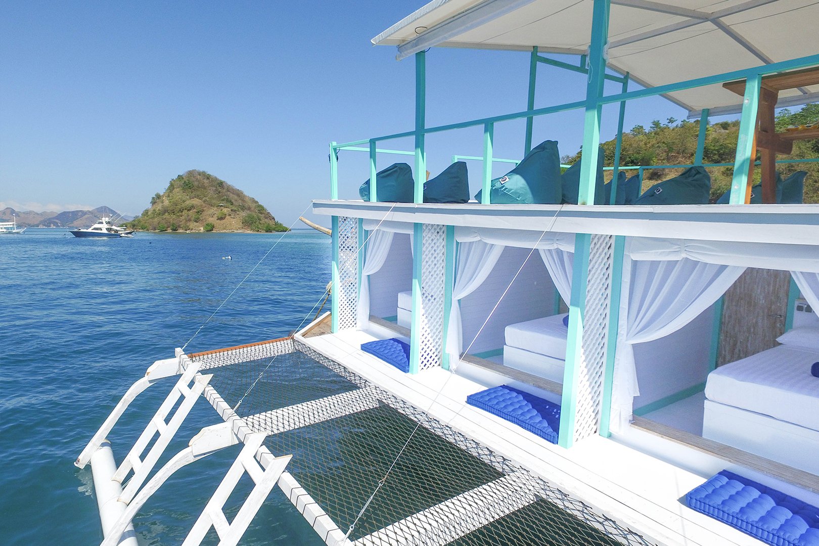 Naast het hotel in het stadje heeft Le Pirate ook een ‘boatel‘. Voor de kust van het strand van Waecicu, zo’n 15 minuten varen vanaf de haven, ligt een drijvend hotel met tien kamers en bovenop een café/restaurant. Net als het hotel op de vaste wal kost een kamer hier 400.000 rupiah per nacht, maar op de boot heb je daarvoor geen airco en moet je de badkamer delen. Daarentegen kun je wel direct vanuit je slaapkamer de zee in duiken! De shuttleboot tussen het boatel en de haven vaart overdag en ’s avonds ongeveer een keer per 2 à 3 uur. Zowel het hotel als het boatel zijn te boeken via lepirate.com/labuan-bajo.