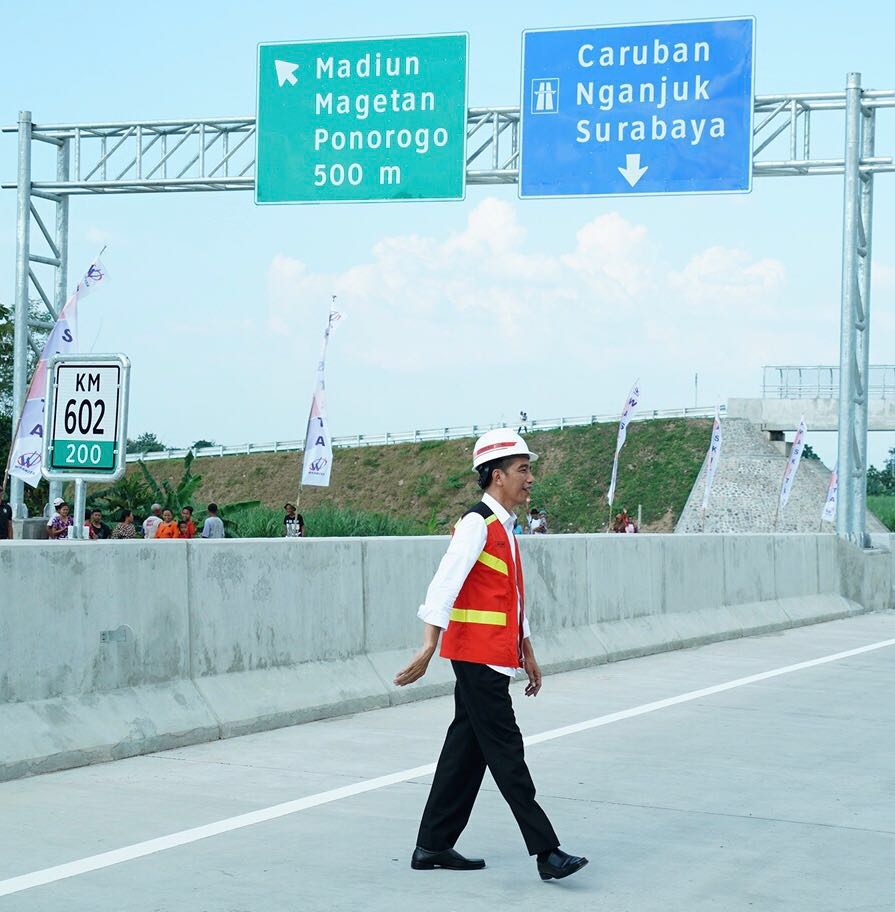 President Joko Widodo bij de opening van het traject Ngawi-Wilangan (maart 2018). De hectometerpaal laat km 602 zien. Dit is de afstand vanaf knooppunt Cawang in Jakarta.