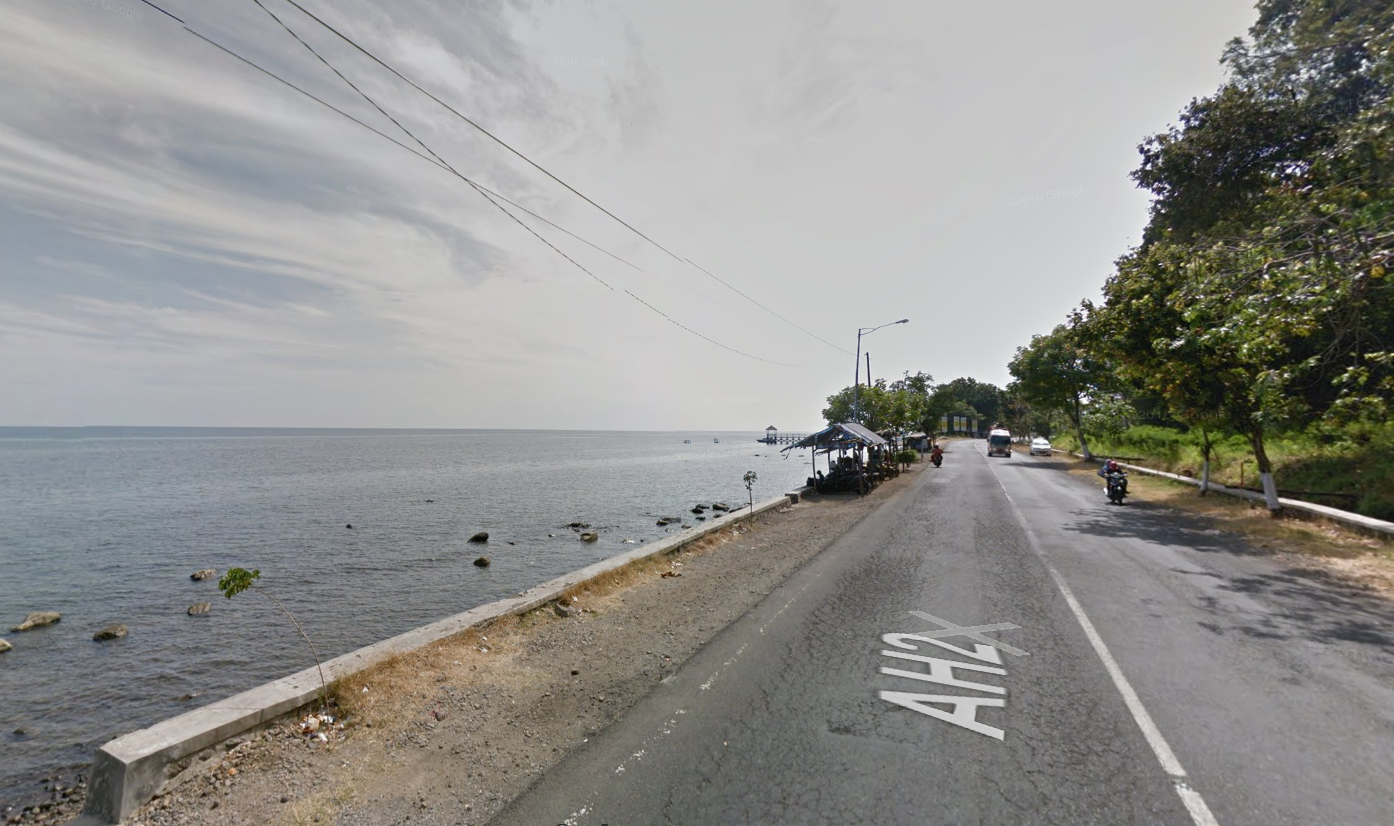 De doorgaande weg Probolinggo-Banyuwangi zoals die nu nog is: tweebaans en op sommige plekken direct aan zee. Bron: Google Streetview.