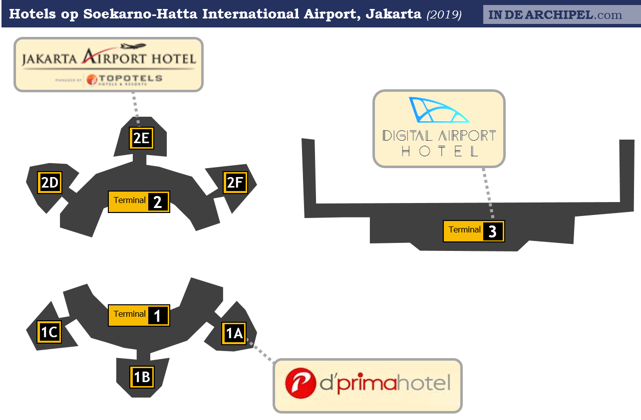 Het D’Prima Hotel Terminal 1A bevindt zich boven terminal 1, waar binnenlandse vluchten van onder andere Lion Air, Citilink en Batik Air vertrekken. De kamers zijn vrij klein, het is soms lawaaiig, niet altijd schoon, en het ontbijt is erg beperkt. De prijs is met € 50 per nacht ook aan de hoge kant. Het meest positieve punt van dit hotel is natuurlijk de locatie, zeker als je een heel vroege vlucht hebt. Rondom het vliegveld bevinden zich echter allerlei betere en goedkopere hotels; zie bijvoorbeeld de ‘budgethotels in de buurt‘ hieronder.