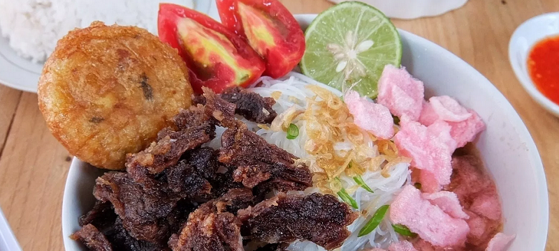 Soto lenthok geserveerd bij Soto Lenthok Tembi in Sewon aan de zuidkant van Jogjakarta.
