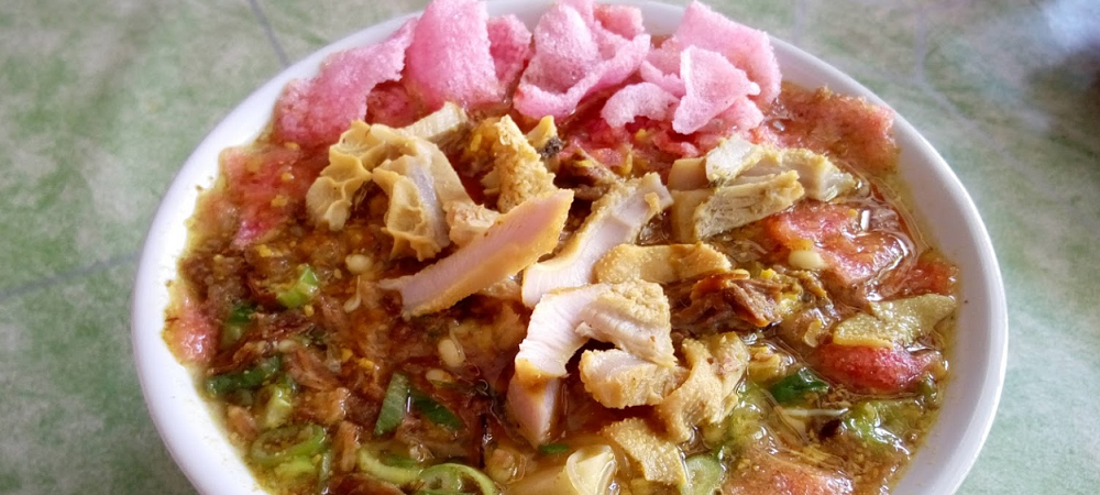Soto kemiri met kip, geserveerd bij Warung Soto Kemiri ‘Pak Kribo’ langs de hoofdweg tussen Kudus en Pati.