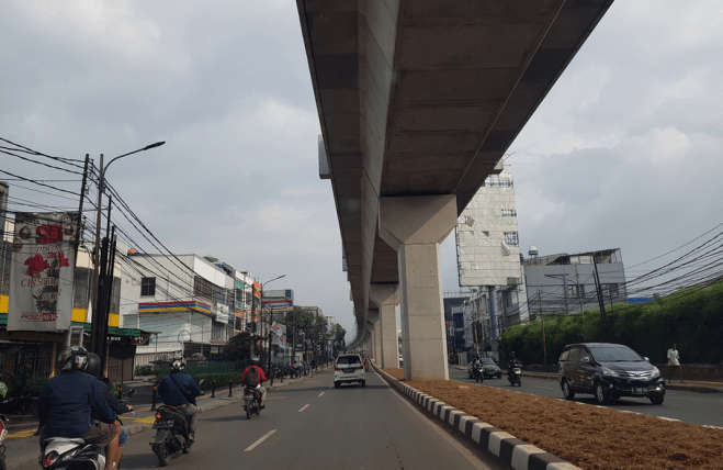 Het zuidelijke deel van de metrolijn loopt hoog boven de straat, zoals hier bij de Jalan RS Fatmawati. Bron: AnakMelayuRiau op Flickr.