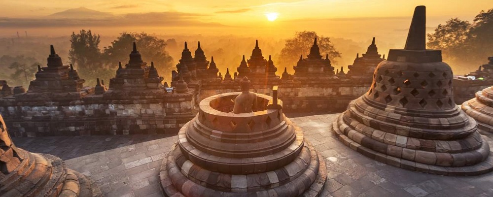 De Borobudur in Midden-Java is waarschijnlijk het beroemdste werelderfgoed van Indonesië. De boeddhistische tempel is gebouwd in de 8e en 9e eeuw, in de tijd dat Java nog boeddhistisch was. In de 14e eeuw was het boeddhisme verdreven door de islam, en eeuwenlang is het bestaan van de tempel onopgemerkt gebleven. Tijdens de korte Britse overheersing aan het begin van de 19e eeuw werd de tempel herontdekt en sindsdien wordt het beschermd. Tussen 1975 en 1982 hebben de Indonesische overheid en UNESCO de Borobudur gerestaureerd en daarna is de tempel in 1991 op de werelderfgoedlijst geplaatst. UNESCO noemt de tempel ‘een meesterwerk van boeddhistische architectuur’ en ‘een uitstekend voorbeeld van Indonesische kunst en architectuur van de 8e en 9e eeuw’. Het tempelcomplex bestaat naast de grote tempel zelf (123 bij 123 meter en 35 meter hoog) ook uit de veel kleinere tempels Mendut en Pawon, die in dezelfde tijd zijn gebouwd.