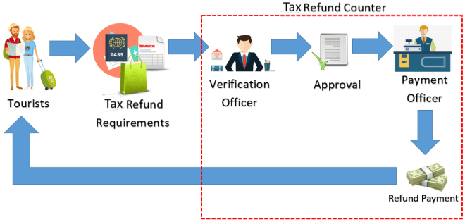 Zoals hierboven aangegeven is btw-teruggave alleen mogelijk voor aankopen gedaan bij een deelnemende winkel waar het “tax refund for tourists”-logo te zien is. Bij betaling in zo’n winkel kun je aangeven dat je btw-teruggave wilt. Je krijgt dan naast de gewone kassabon een speciale btw-factuur. Je moet hierbij je paspoort laten zien, en je paspoortnummer wordt op de factuur ingevuld. De factuur moet in drievoud worden ingevuld: één voor de winkel zelf en twee voor jou om mee te nemen (een voor jezelf en een voor inlevering op het vliegveld).