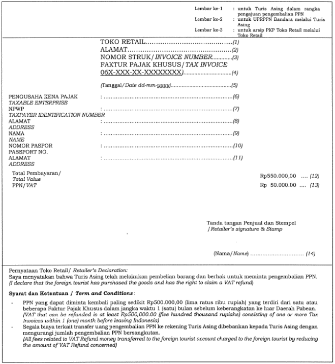 Voor vertrek uit Indonesië ga je op de luchthaven (zie hieronder voor de precieze locaties) naar de btw-teruggave-balie (tax refund counter of in het Indonesisch Unit Pelaksana Restitusi Pajak Pertambahan Nilai, UPRPPN). Hier moet je kunnen laten zien:
