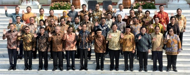 Van de 34 ministers zijn er 17 partijpolitici, terwijl de overige 17 onafhankelijke technocraten zijn. Van de 17 partijpolitici zijn er vier van Jokowi’s eigen partij PDI-P. De rest zijn van coalitiegenoten Golkar (4), PKB (3), NasDem (3) en PPP (1). Opvallend is dat er daarnaast twee ministers zijn van de partij Gerindra van verliezend presidentskandidaat Prabowo Subianto (waaronder hijzelf). Door zijn grootste tegenstander op te nemen in zijn kabinet hoopt Jokowi te werken aan een ‘regering van nationale eenheid’. Voor meer informatie, zie de artikelen over de politieke partijen en over de presidentskandidaten.